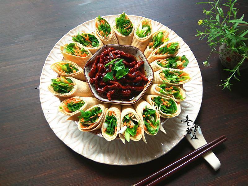 5.將切好的干豆腐卷碼在盤子四周,中間留有空位