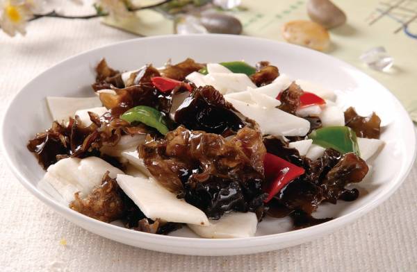 3、加入豆腐結和木耳翻炒。
