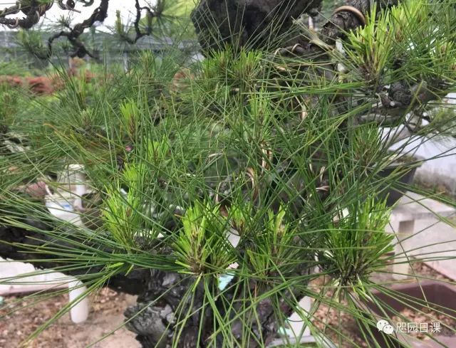 大部分常見松樹都是一樣處理的。如果準備做短針法的黑松和馬尾松等品種,摘芽時可將新芽留得稍微長一些,只要將過長的新芽摘短,保持整樹新芽的均勻生長,使得6月份做短針時有足夠的養分第二次萌發新葉。