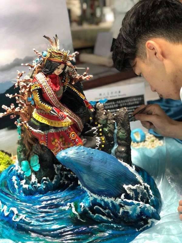 17歲的王奕凱今年參加「2018新加坡FHA國際美食競賽」,是賽內最年輕的選手,還必須和100多名業界專業人士競爭。這次他以「與大自然共舞」為主題,設計出原住民公主、鯨魚、原生蝴蝶融合的作品,奪得翻糖組銀牌獎章!