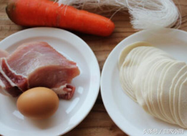 冬粉在溫水中浸泡半小時,胡蘿蔔切絲,雞蛋打散;