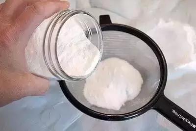 接著把小蘇打倒在篩網裡,慢慢地均勻地灑在床墊上去,記得溫柔點哦。