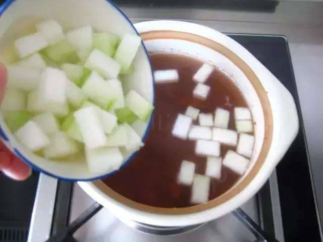4、冬瓜去皮、去瓤切小丁,放入鍋中