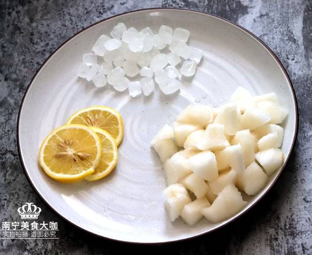 準備好食材:雪梨1個、冰糖30克、檸檬3片、礦泉水2杯