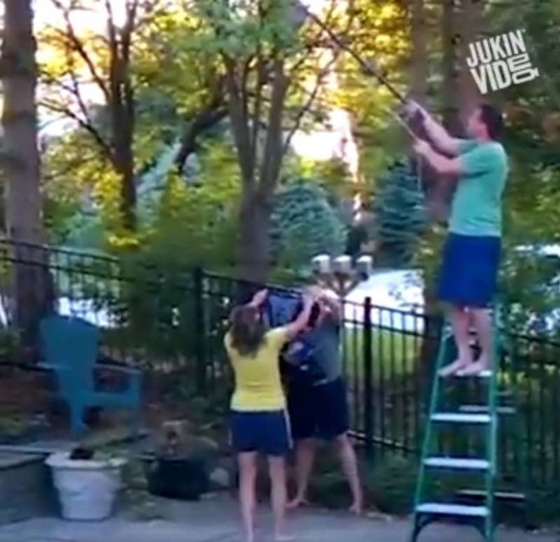 這三個人發現樹上有蜂窩後,決定同心協力將蜂窩給拿下來,其中一個人站在梯子上,下面兩個人則是打算將蜂窩給接住。