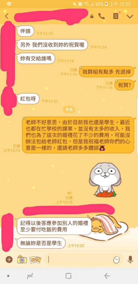 這位伴娘被新娘索要「紅包」時,她解釋自己目前還是學生,最近也都在忙學校的課業、並沒有太多的收入,而且也為了這次婚禮花了不少的費用,所以沒辦法包紅包給新娘,但還是給予新娘滿滿的祝福。沒想到老闆竟然不領情,還提醒她「記得以後答應參加別人的婚禮,至少要付吃飯的費用,無論妳是否是學生」。