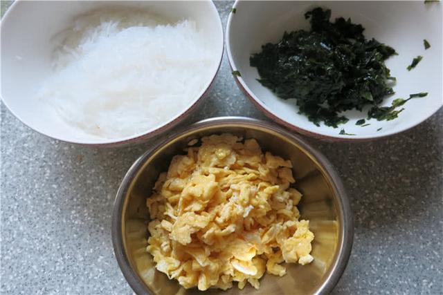 7.泡軟的粉絲控干水切成段,海菜控干水剁幾刀,雞蛋炒成雞蛋碎