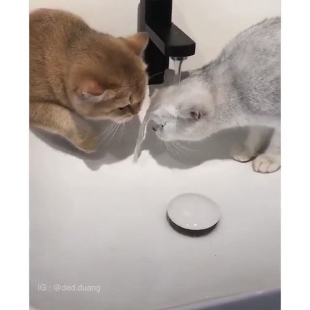 一棕一灰兩隻喵喵正站在洗手台邊,想喝水龍頭裡流出的水水,不過這水流怎麼歪向了一邊?仔細一看才發現原來灰喵的頭抵在了水龍頭下方,水當然就順著它的額頭流...「唉唉你過去一點,我要喝水啦~吼,會不會喝啊你!」