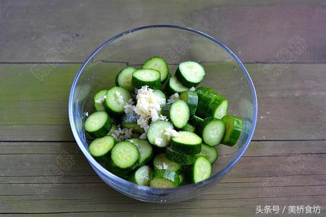 2、黃瓜用鹽和蒜腌一下,既脆又入味,遇熱還不變色,但不要久腌,以免出水影響口感。