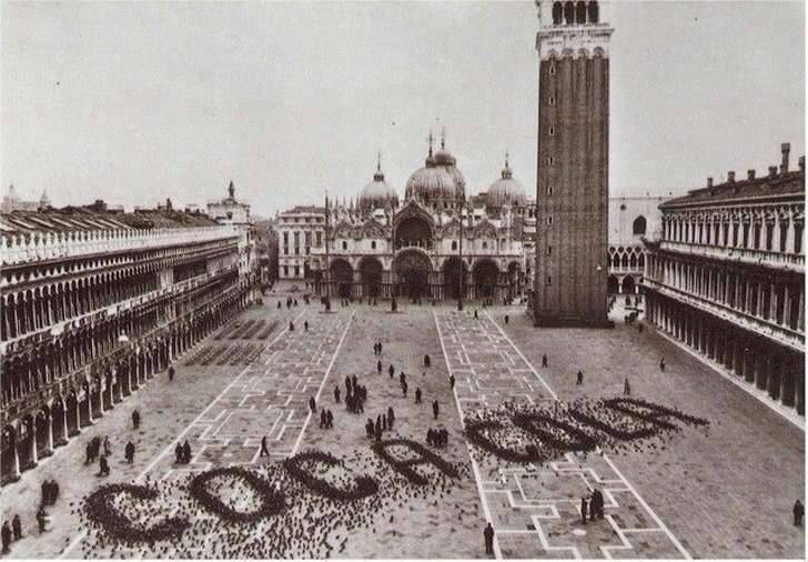 1960年代,可口可樂公司在威尼斯的廣場吸引鴿子,組成商標做廣告。