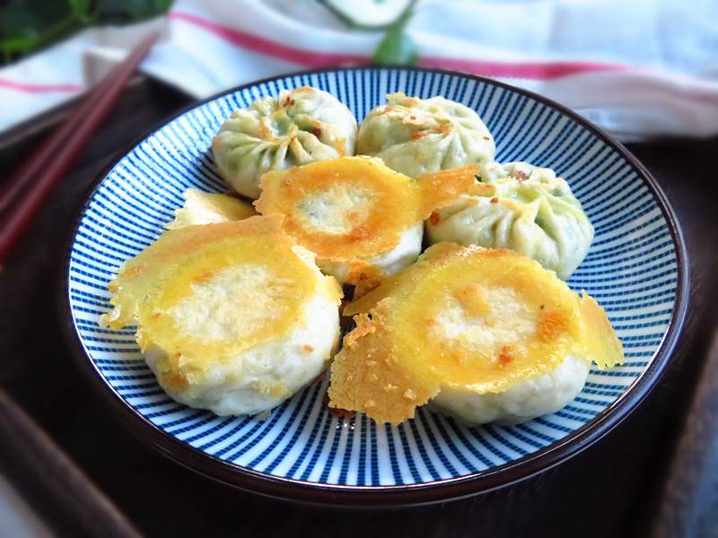 5、熱鍋少油,轉小火,將肉餡的一面先放入鍋內煎至定型