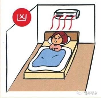 床位安置在空調下方,寒氣不斷吹向頭、肩、頸,加上人在睡眠狀態時,毛細孔會略微放開,輕者經常感冒,重者會造成頭、肩、頸的神經緊張、肌肉僵化。