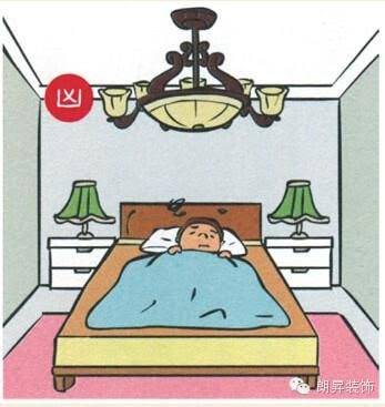 臥房的天花板,應簡單為宜。千萬別學商業空間,弄得非常藝術、奇特、花樣百出,甚至裝上鏡子,這會使人不易入睡,久而久之健康會出問題。床位上方不可掛奇形怪狀的燈具,會使人產生緊張不安的感覺。在地震頻發的當今,床的正上方最好是完全沒有任何燈具,臥室照明盡量使用床頭桌燈或立燈及靠近牆邊的隱藏燈管。