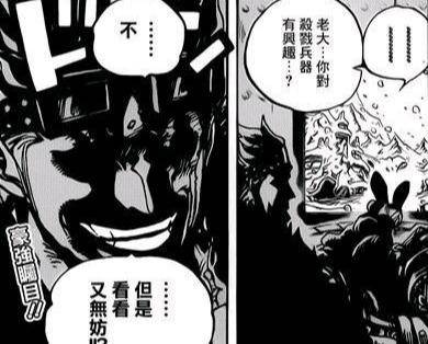 基德怒了,公布真相,說懟上大媽海賊團是個意外,他只是為了奪回自己的東西打傷了將星。至於手臂,在之前懟上紅髮海賊團的時候就被打斷了。也就是說,手臂是紅髮海賊團弄沒的。不過,他會向紅髮海賊團報仇的,還會打敗凱多。路飛接話,打敗凱多的是一定是自己,而不是基德。