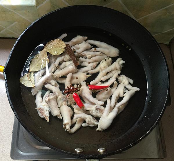 另起鍋,焯水的雞爪冷水下鍋,加一個小米椒,花椒,香料和白醋。
