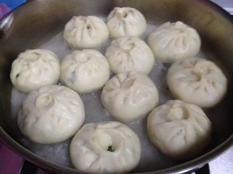 8.平底鍋加入少量油燒熱,把生坯擺入,之間要留有空隙,煎至底部稍有硬殼。倒入一碗清水,清水大概在包子的2/3處