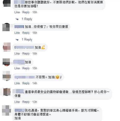 PO文一出後,網友們紛紛鼓勵她,替她加油打氣,「還滿心疼妳的遭遇~希望妳的身體能趕快復元喔」;也有網友譴責:「他們是腦袋壞了才需要博愛座」、「我也遇過,默默的拿出身心障礙者手冊,對方才閉嘴」、「有些人就是不會有同理心!倚老賣老」。