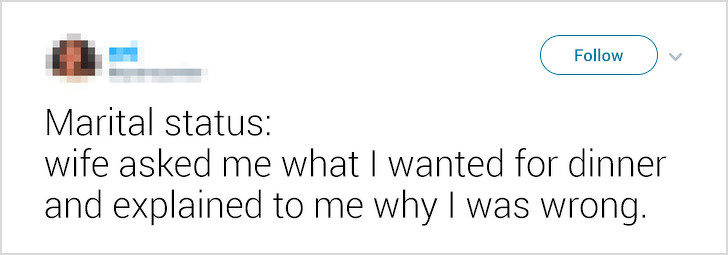 4. 「婚姻狀況:老婆問我晚餐要吃什麽,然後向我解釋我做錯了什麽。」