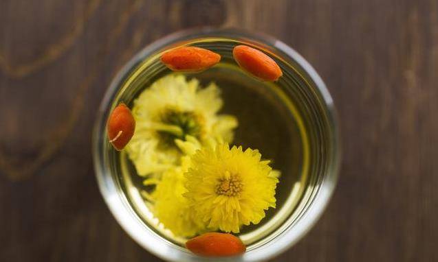 做法:菊花10朵,枸杞20顆,冰糖適量,90度以上熱水燜泡兩分鐘,即可飲用。
