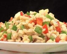 1、茭白去掉外層厚皮洗凈後切小丁。青紅椒去蒂去籽後洗凈切小丁。雞胸肉切碎,放在小碗中,調入料酒,1/4茶匙鹽,色拉油和蛋清攪拌均勻後腌制10分鐘