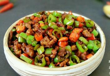 1.辣椒切小丁,豬肉切肉末備用,熱鍋涼油放入肉末,炒至變色