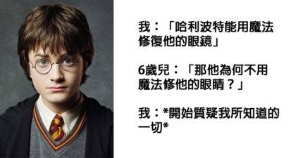 2. 我:「哈利波特能用魔法修復他的眼鏡」6歲兒:「那他為何不用魔法修他的眼睛?」我:*開始質疑我所知道的一切*