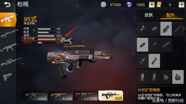 而國產槍械95式的兩種95式專用擴容彈鼓,能夠使它彈夾容量高達50、65,是荒野行動中彈夾容量最高的槍械,再配上其它配件,別提有多強了。