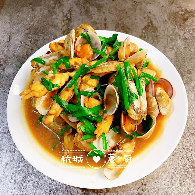 4.再利用剩餘的油,把花菜炒一下,花菜翻炒1分鐘後,加入適量蒸魚豉油、生抽、蚝油、鹽調味,將調料炒勻後關火倒出。
