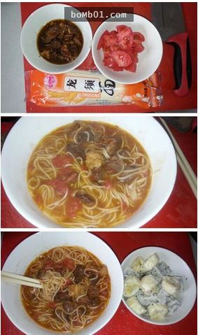 鍋入水燒沸,入餃子煮之,同時取碗調味汁,比例:紅油2、生抽2、醋2、蒜1、糖2、鹽1